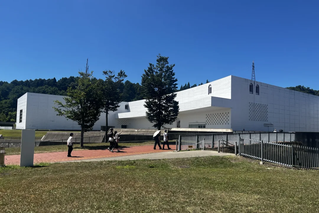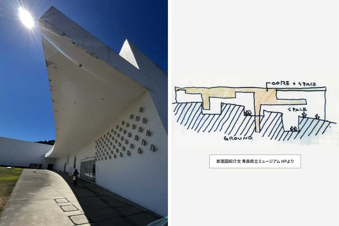 青森県立美術館は、隣接する三内丸山縄文遺跡の発掘現場から着想を得て設計されています。発掘現場で見られるトレンチ(壕)のように、地面が幾何学的に深く切り込まれ、その上を白く塗装された煉瓦の量塊が覆いかぶさる構成を持っています。